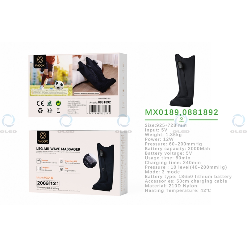 MX0189 MASAJEADOR DE COMPRESIÓN DE AIRE PARA PIERNAS RECARGABLE 12W 2000MAH - NEGRO..