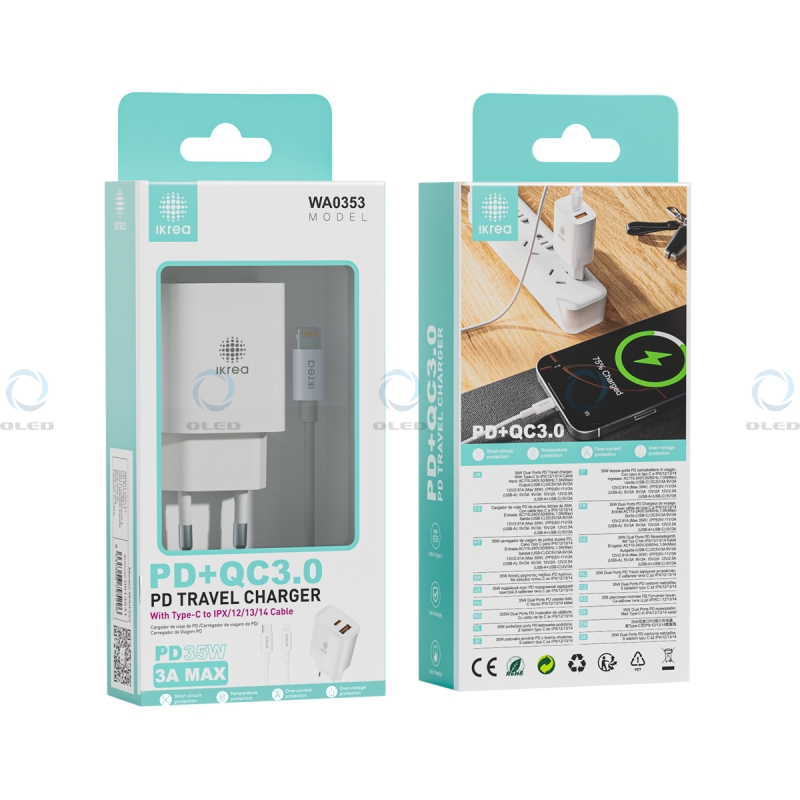 IKREA WA0353 CARGADOR 2 PUERTOS PD+QC3.0 CON CABLE TYPE-C TO LIGHTNING 35W 3A MAX BLANCO