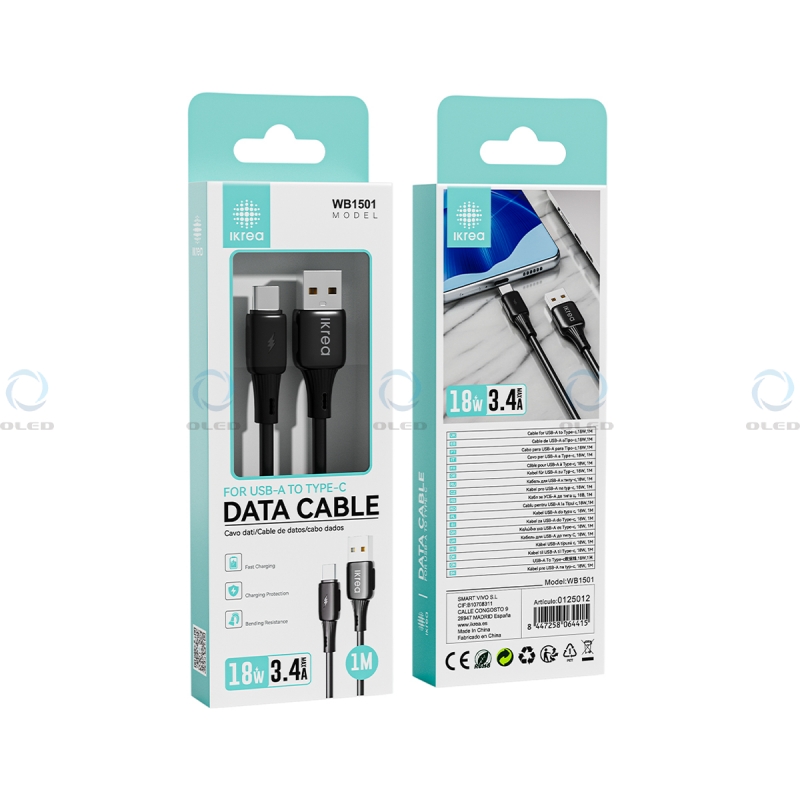 IKREA WB1501 CABLE DE DATOS TYPE-C 18W 3.4A MAX 1M NEGRO