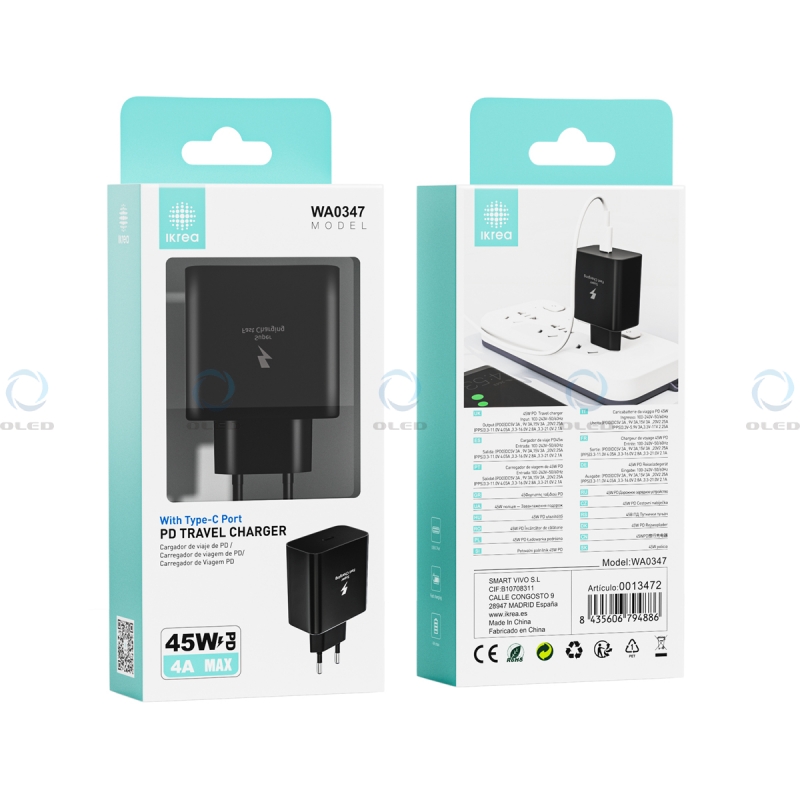 IKREA WA0347 CARGADOR PD CON PUERTO TYPE-C 45W 4A MAX NEGRO