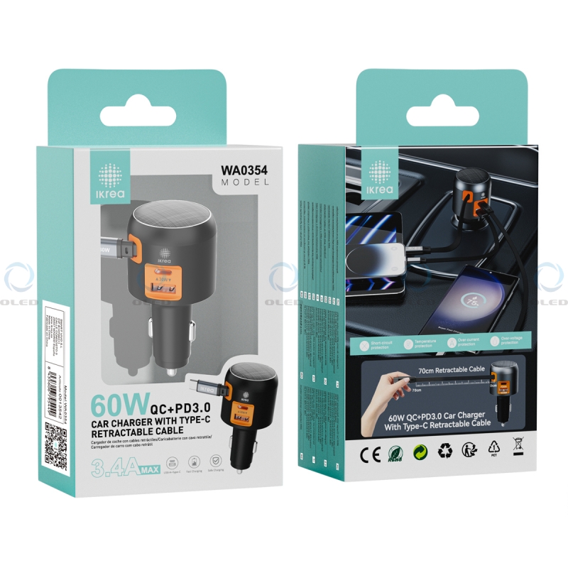 IKREA WA0354 CARGADOR QC+PD3.0 PARA COCHE 2 PUERTOS CON CABLE TYPE-C RETRACTABLE 60W 3.4A MAX NEGRO