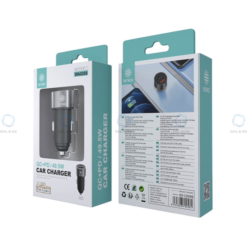 IKREA WA0269 CARGADOR QC+PD PARA COCHE 2 PUERTOS TYPE-C/USB-A 4.5A 49.5W NEGRO..