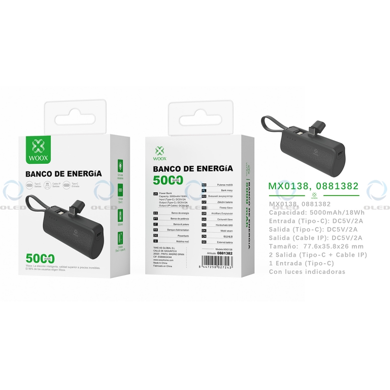 MX0138 Power Bank 5000mah 5V2A with IP cable&Type-C adapter ABS+PC-Negro