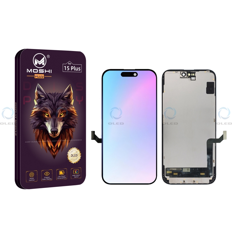 Pantalla completa para iPhone 15 Plus negra OLED(MOSHI PLUS)..