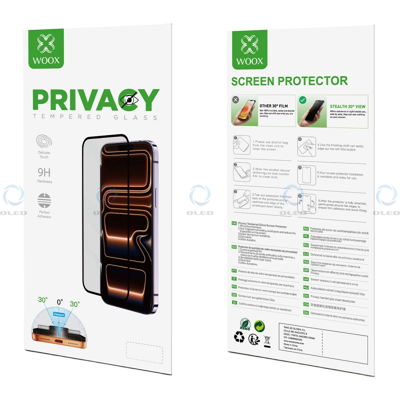 WOOX PROTECTOR DE PRIVACIDAD 9H PARA IPHONE 13/13 PRO/IPHONE 14/16E/17E NEGRO