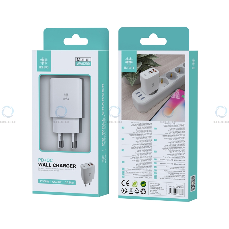 IKREA WA0290 CARGADOR PD 2 PUERTOS USB-A/TYPE-C SIN CABLE PD 36W/QC3.0 30W 3A BLANCO..