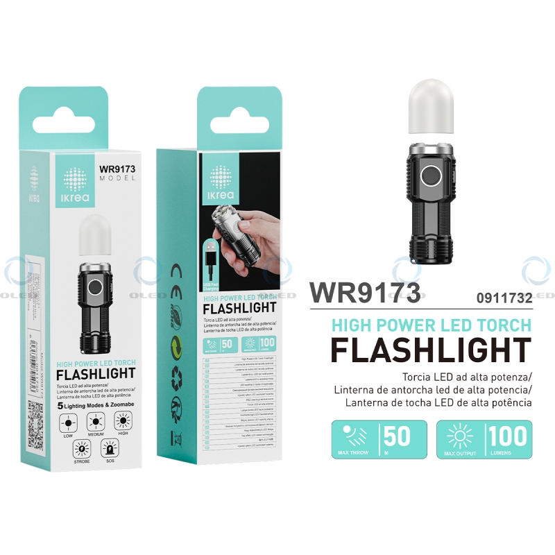 IKREA WR9173 LINTERNA DE ANTORCHA LED ALTA POTENCIA INTERFAZ USB 5 MODOS 50M 100 LÚMENES