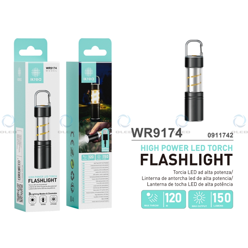 IKREA WR9174 LINTERNA DE ANTORCHA LED ALTA POTENCIA INTERFAZ USB 3 MODOS 120M 150 LÚMENES