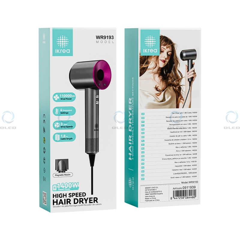 IKREA WR9193 SECADOR DE PELO DE ALTA VELOCIDAD CON BOQUILLA MAGNÉTICA 1400W 1.8M GRIS..